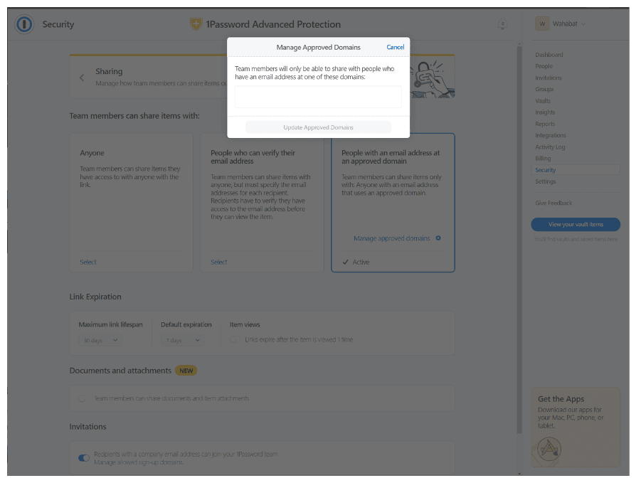 For additional security, we recommend you to setup specific approved domains, so you know who can access the links that your team shares.